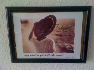 Teksten på postkortet er: "The best and most beautiful things in life cannot be seen or even touched. They must be felt with the heart". Citatet er af den blinde og døve amerikanske forfatter Helen Keller. Jeg har også måttet klippe dette kort til for at få plads til det i rammen. Det er et gammelt kort jeg fik af min farfar på min fødselsdag da jeg har været omkring ti år. Ordene "Tillykke med fødselsdagen - Farfar" står stadig bag på kortet.